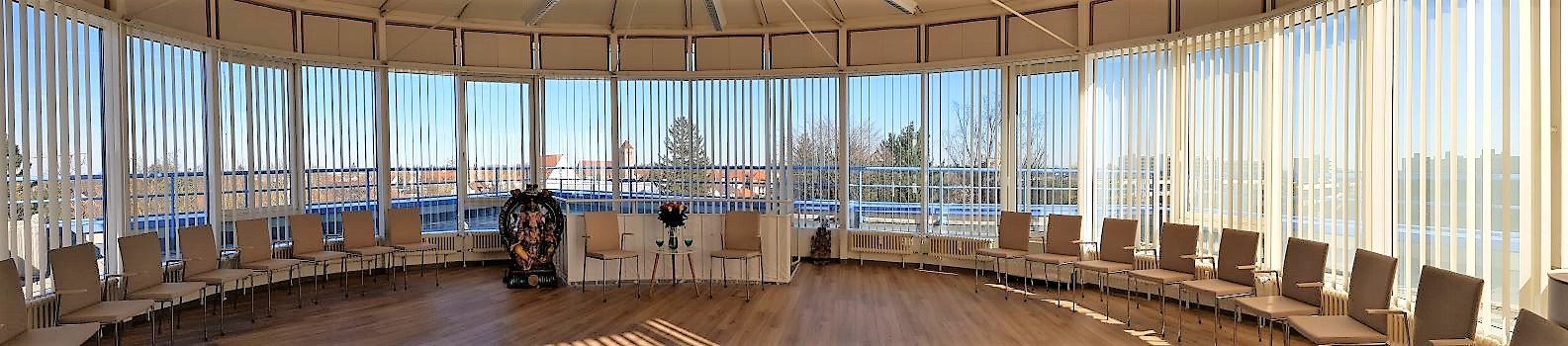 Unser Seminarraum ist eine Glaskuppel mit Klimaanlage im 4. OG, mit ca. 100 qm Dachterrasse und 180 Grad Panoramablick. Mit professioneller Audio- und Videotechnik ausgestattet. Denkbare Nutzung für z.B. bestuhlte Seminare wie The Work, Theta Healing®, Hypnotherapie u.ä. oder Vorträge mit bis zu insgesamt 26 Stühlen der Extraklasse. Körperorientierte Seminare wie Tantra Trainings, Massageausbildung oder Yoga für bis zu 18 Teilnehmer. Selbstverständlich bieten wir dir auch die dafür notwendigen Hilfsmittel wie AIREX Matten, Meditationskissen, Yoga-Matten, Decken etc….